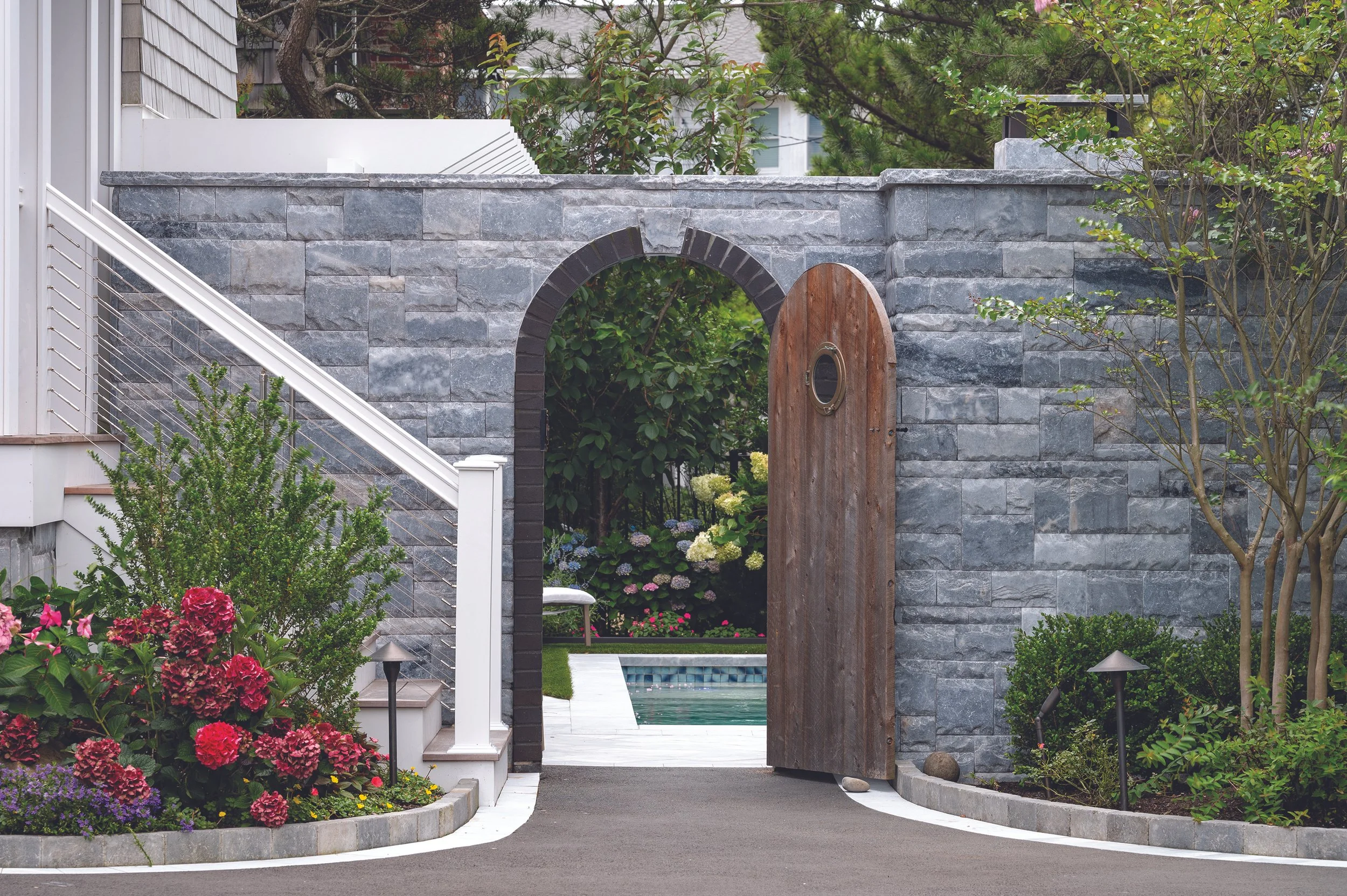 A stone-entry wall that doubles as a fireplace and pizza oven, enclosing the pool with beauty and safety in mind